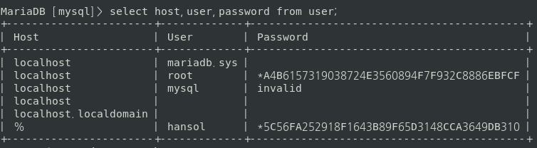 MariaDB [mysql]> select host,user,password from user;