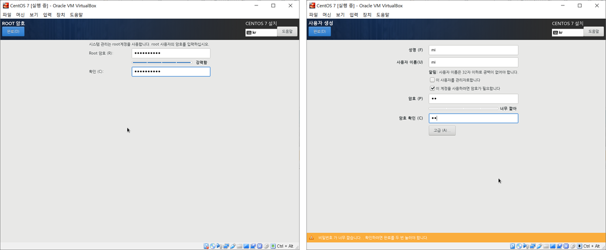 암호가 너무 짧다고 알림이떠도 무시하고 완료 버튼을 두번 누릅니다.