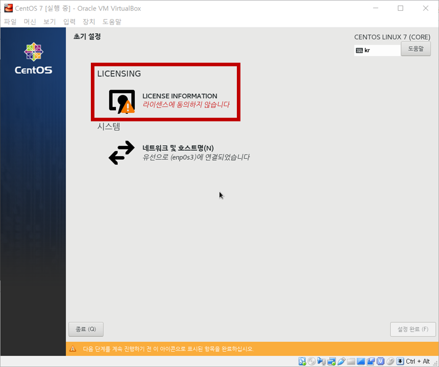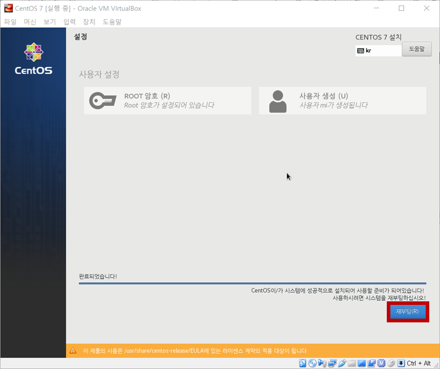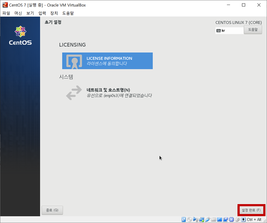 10. 설정 완료(F)를 눌러서 CentOS 설정을 마칩니다.