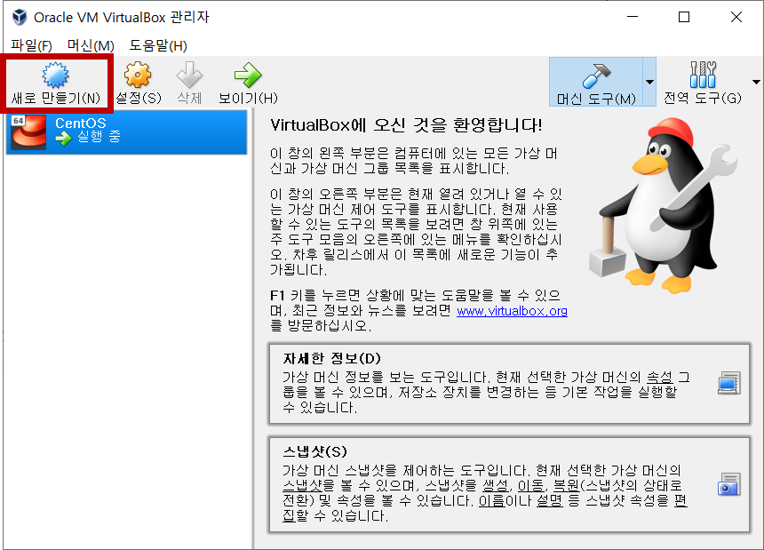 1. 설치한 VirtualBox를 시작합니다.