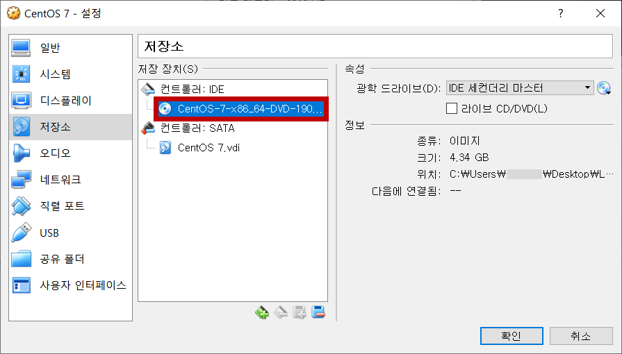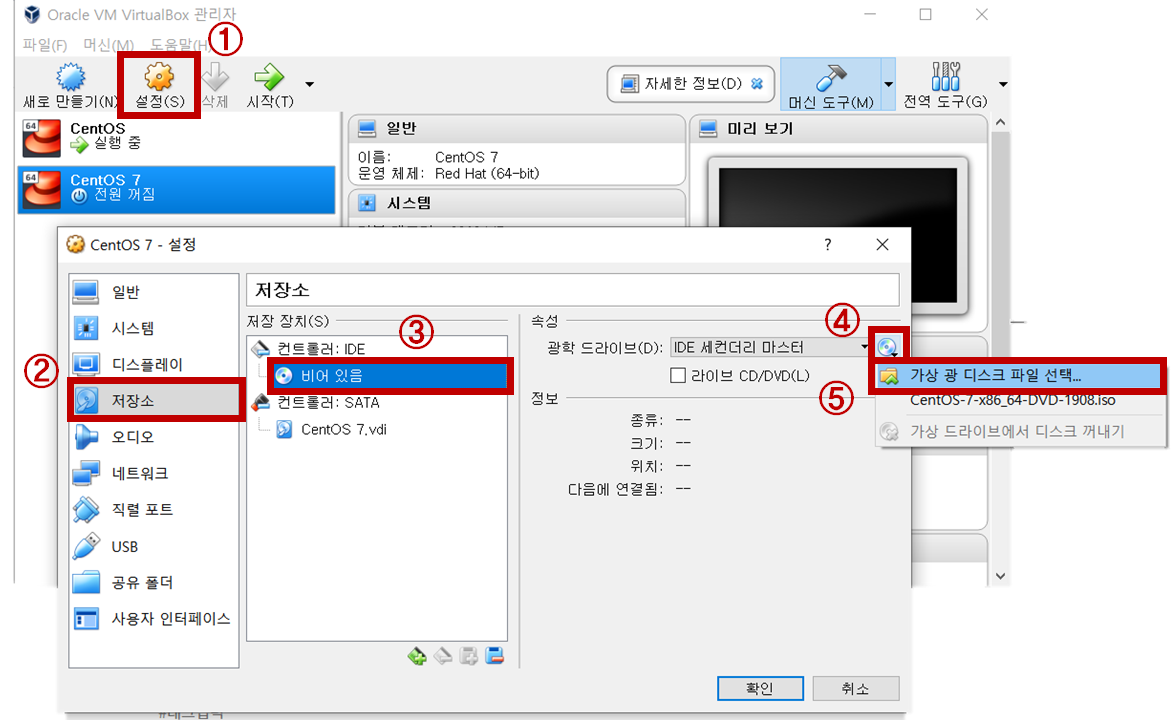 순서대로 선택해서 위에서 다운받은 CentOS 7.iso 파일을 선택합니다.