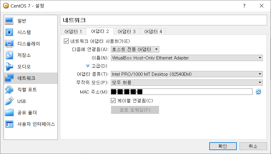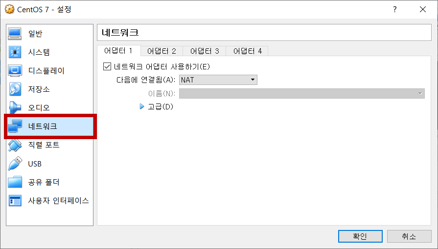 2) [어댑터 1] 탭을 다음과 같이 변경합니다.