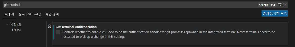 파일-기본설정-설정-git.terminal 검색후 authentication 해제 하고 vscode 재부팅 하고 터미널 다시 실행