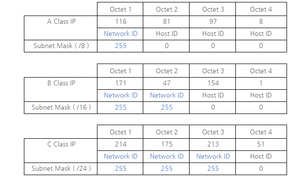 각 클래스마다 Network ID로 사용되는 옥탯에 255가 있다는 점을 확인할 수 있다.
