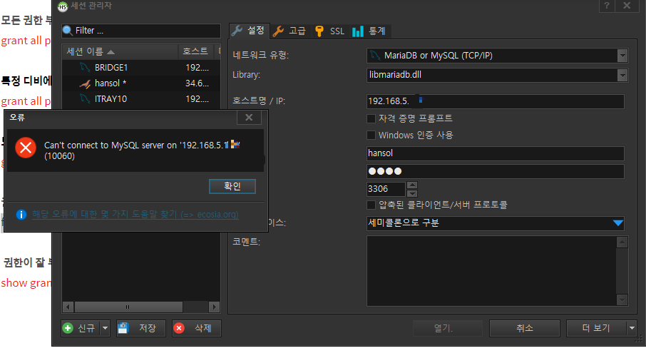 GRANT ALL PRIVILEGES ON *.* TO 'root'@'172.10.0.254' IDENTIFIED BY '패스워드';