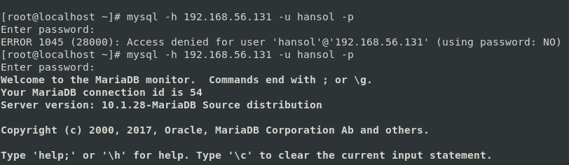 부여가 됐다고 나왔음 %계정 생성시 mysql -h 192.168.56.131 -u hansol -p 이렇게 접속해야함