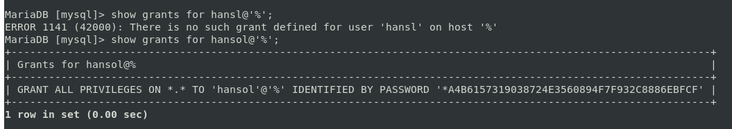 Show grants for hansol@'%' 로 권한 다 부여 됐는지 확인 함