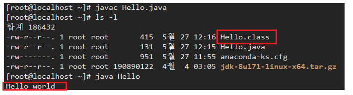 마지막으로 Hello world가 잘 출력이 되는지 Hello.java 파일을 컴파일하고 실행하겠습니다.