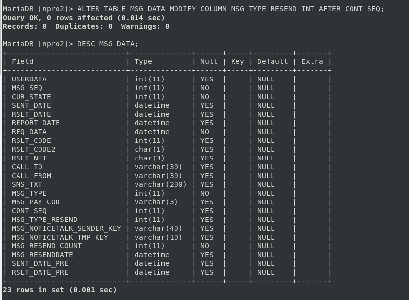 ALTER TABLE 테이블명 MODIFY COLUMN 컬럼명 자료형 AFTER 다른컬럼;