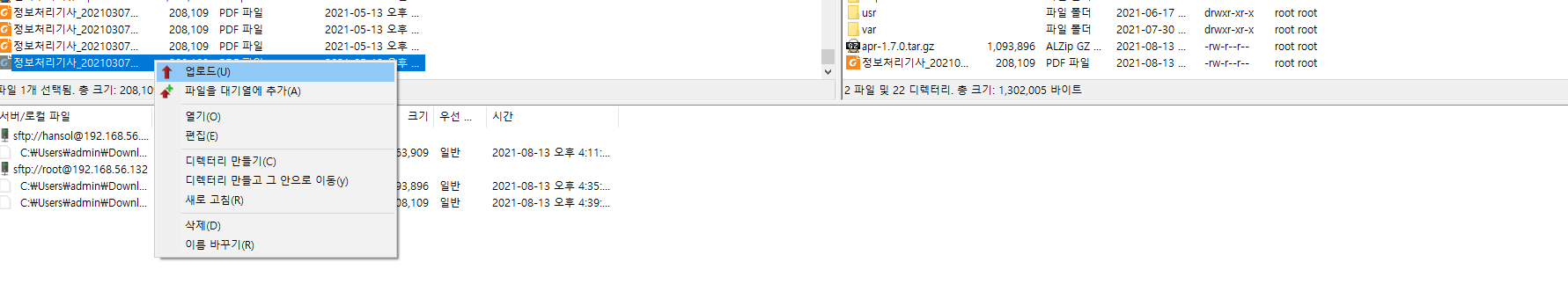 옮길 파일을 선택하고 업로드를 눌러주면 파일 전송이 가능하다
