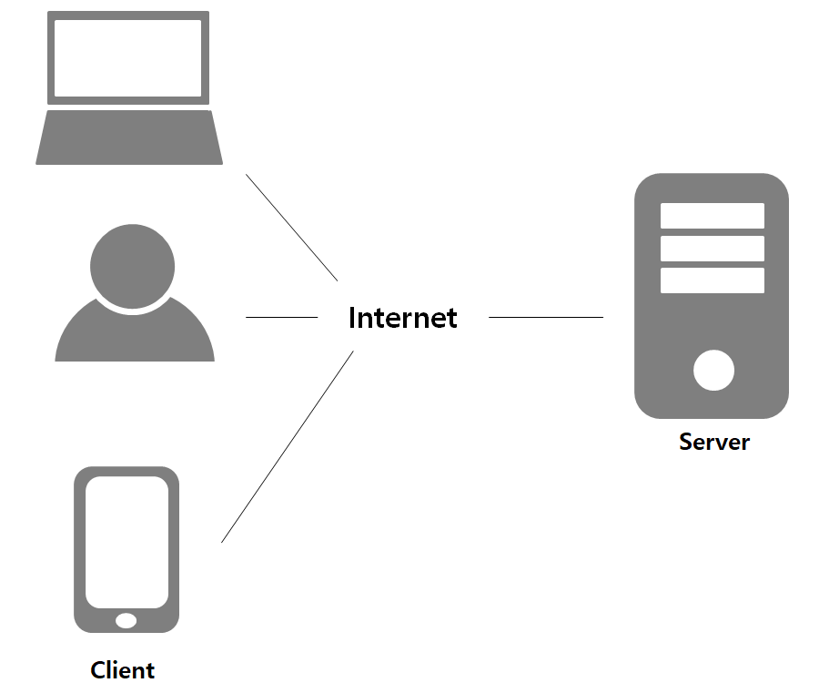그림1 에서는 클라이언트는 사용자, 스마트폰 단말, PC, 브라우저, 어플 등을 뜻합니다. 보는 관점에 따라 사용자가 될 수도 있고, 브라우저가 될 수도 있습니다. 사용자는 PC 혹은 스마트폰 등을 이용하여 브라우저, 어플 등을 통해 어떠한 이벤트(로그인 버튼을 클릭한다던가)를 발생시켜, 브라우저, PC, 혹은 스마트폰 단말기가 서로 상호작용하며 Server에게 이벤트에 대한 요청(request)을 보내게 됩니다. 어떠한 관점에서 보든 요청(request)를 보내는 역할을 하는 매개체는 클라이언트로 볼 수 있습니다.