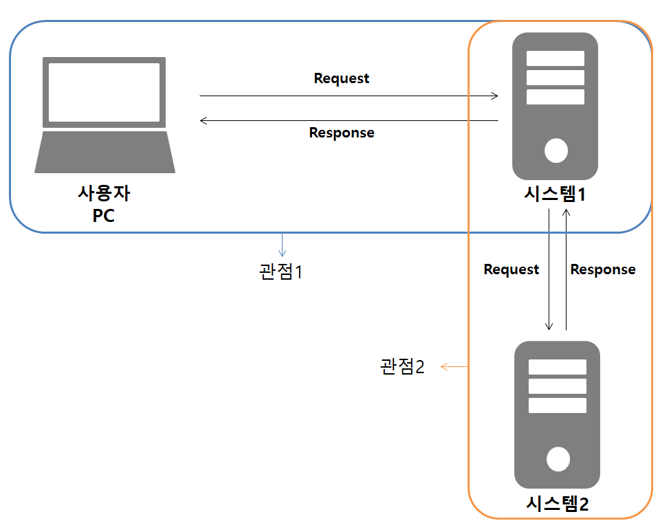 그림 4에서 관점1은 그림2와 동일해 집니다. 즉 서버는 시스템1, 클라이언트는 PC, 혹은 사용자가 되겠습니다.