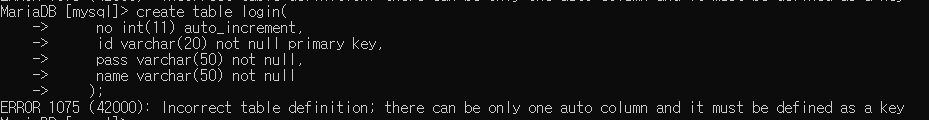 테이블을 만들고 auto 넣으려고 했는데 오류가 뜬다