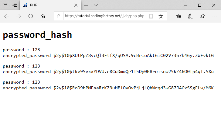 <!doctype html> <html lang="ko"> <head> <meta charset="utf-8"> <title>PHP</title> <style> body { font-family: Consolas, monospace; } </style> </head> <body> <h1>password_hash</h1> <?php $password = '123'; $encrypted_password = password_hash( $password, PASSWORD_DEFAULT); echo '<p>password : ' . $password . '<br />encrypted_password ' . $encrypted_password . '</p>'; $encrypted_password = password_hash( $password, PASSWORD_DEFAULT); echo '<p>password : ' . $password . '<br />encrypted_password ' . $encrypted_password . '</p>'; $encrypted_password = password_hash( $password, PASSWORD_DEFAULT); echo '<p>password : ' . $password . '<br />encrypted_password ' . $encrypted_password . '</p>'; ?> </body> </html>