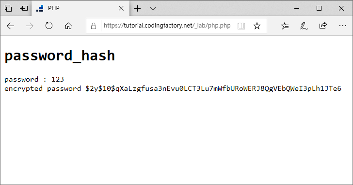 <!doctype html> <html lang="ko"> <head> <meta charset="utf-8"> <title>PHP</title> <style> body { font-family: Consolas, monospace; } </style> </head> <body> <h1>password_hash</h1> <?php $password = '123'; $encrypted_password = password_hash( $password, PASSWORD_DEFAULT); echo '<p>password : ' . $password . '<br />encrypted_password ' . $encrypted_password . '</p>'; ?> </body> </html>