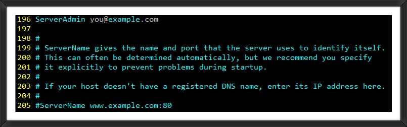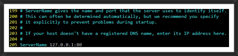 아파치 conf 파일 ServerName 에서 주석을 지워주면 된다