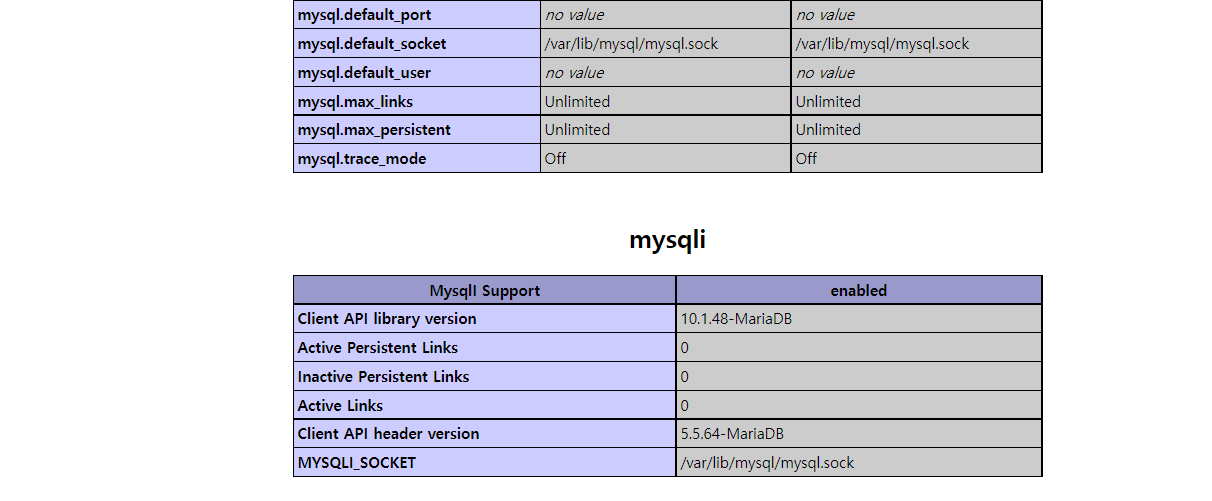 php 정보를 확인 해보면 mysqli가 새롭게 생긴 걸 확인 할수 있음